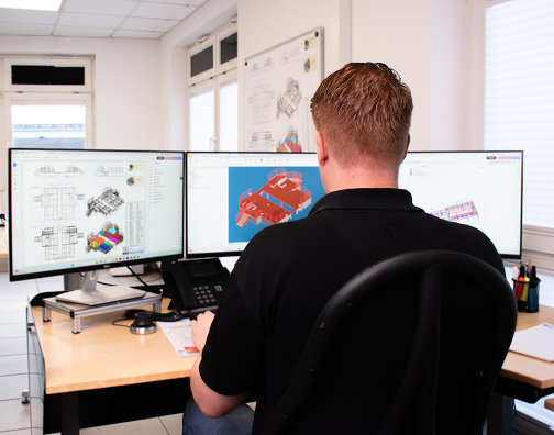 In unserer Abteilung Konstruktion/Entwicklung erstellen wir in enger Zusammenarbeit mit unseren Kunden alle erforderlichen Zeichnungen – von Layout- und Aufstellungsplänen der gesamten Anlage (inklusive Integration von Kundenzeichnungen) bis hin zu Einzelteil- und Fertigungszeichnungen.